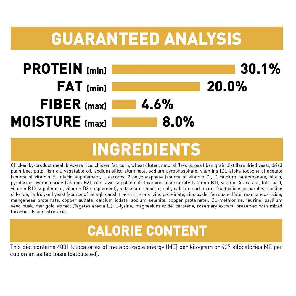 Dehydrated poultry protein, rice, animal fats, maize, vegetable protein isolate*, hydrolysed animal proteins, vegetable fibres, beet pulp, yeasts and parts thereof, fish oil, soya oil, minerals, psyllium husks and seeds (0.5%), fructo-oligo-saccharides, hydrolysed yeast (source of manno-oligo-saccharides), yeast extracts (source of beta glucans), borage oil, marigold extract (source of lutein).