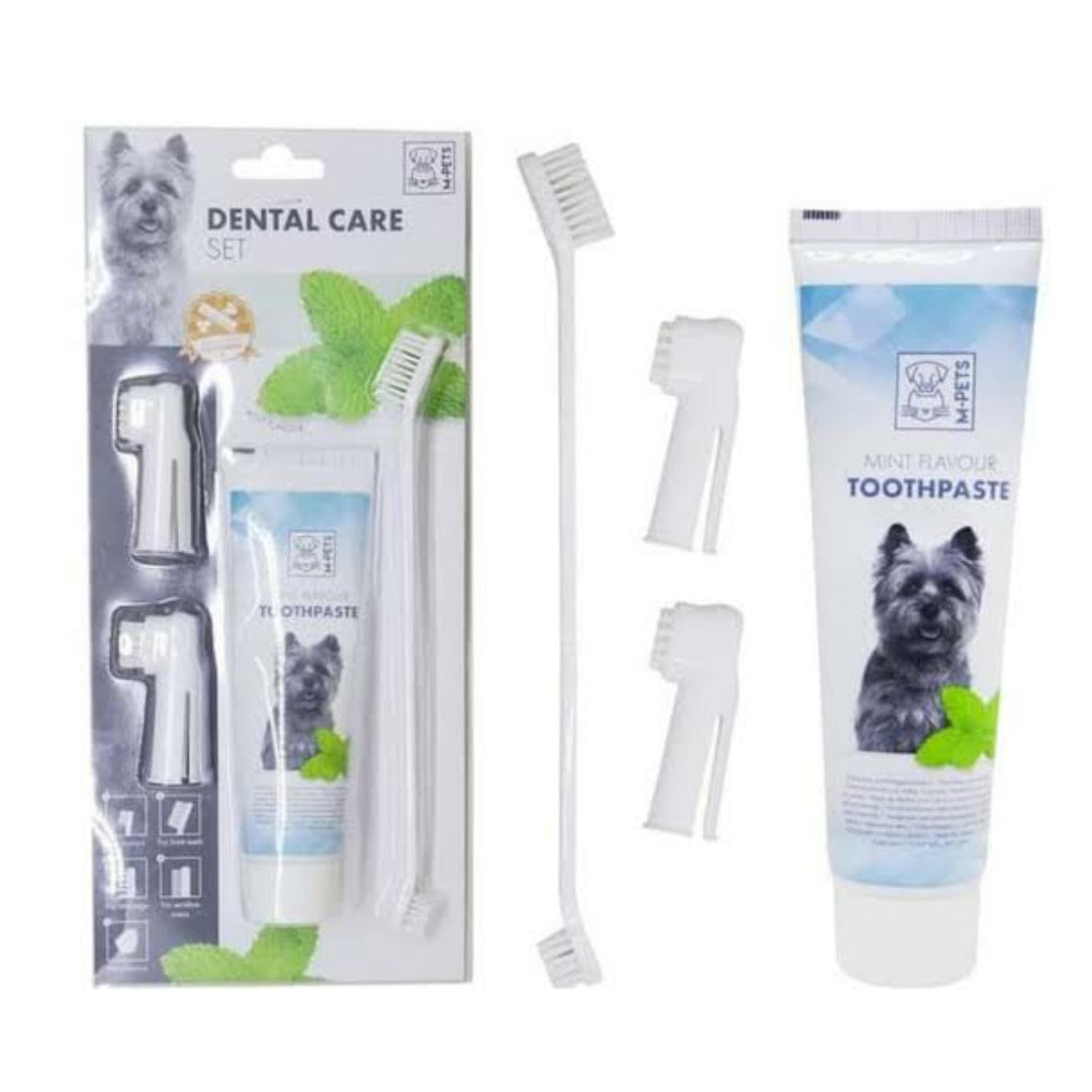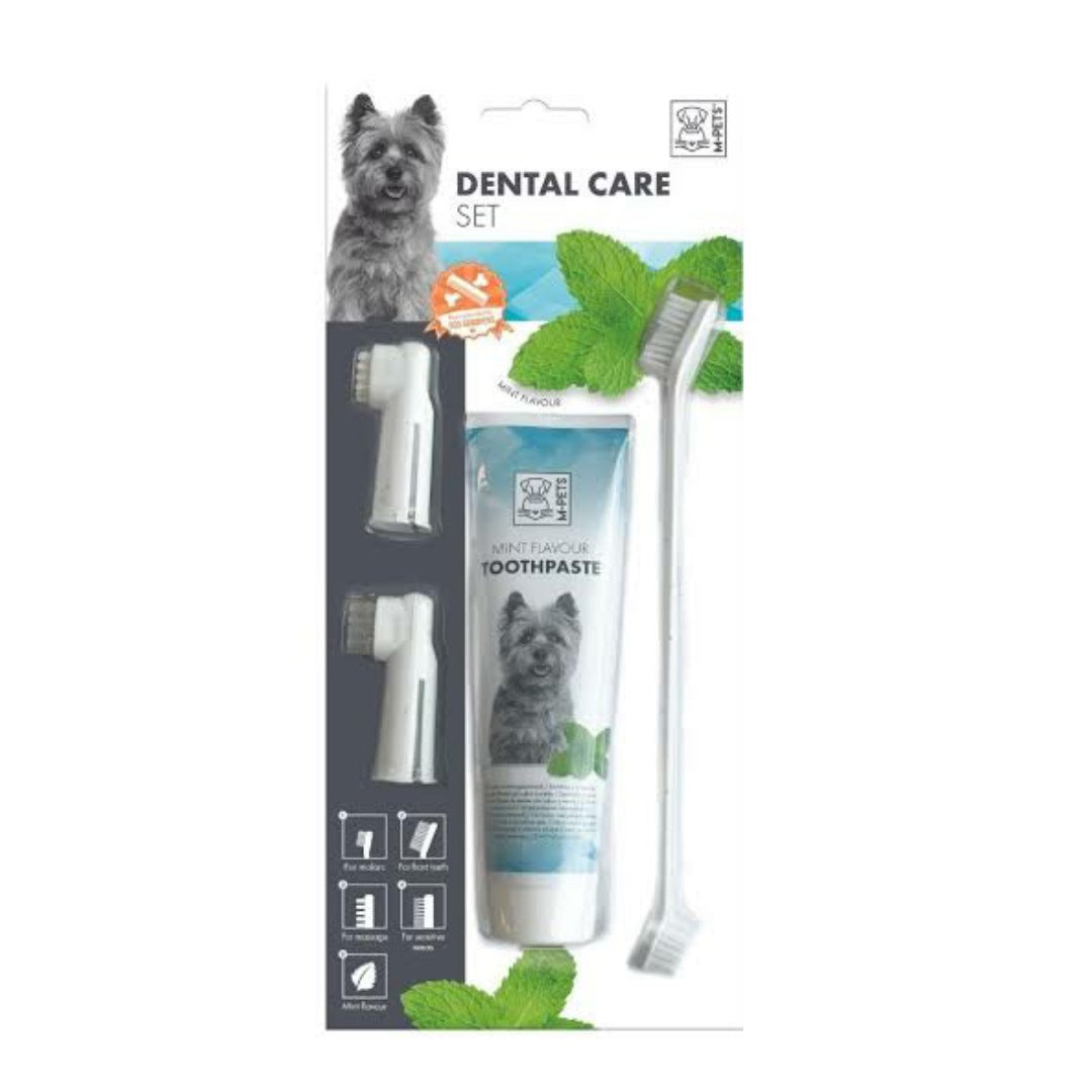 The M-Pets Dental Care Set includes a Finger toothbrush, Massage brush, Double-ended brush and Mint Flavoured Toothpaste.