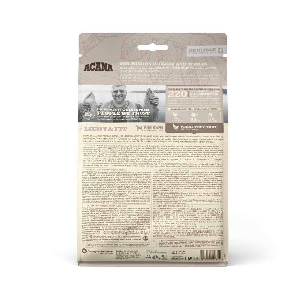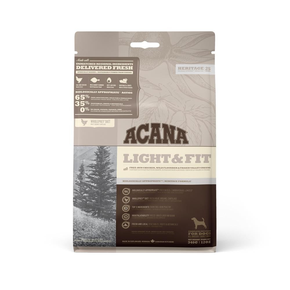 - ACANA Light & Fit dog food is nutrient-dense and high in protein, nourishing dogs completely with whole free-run chicken and turkey.