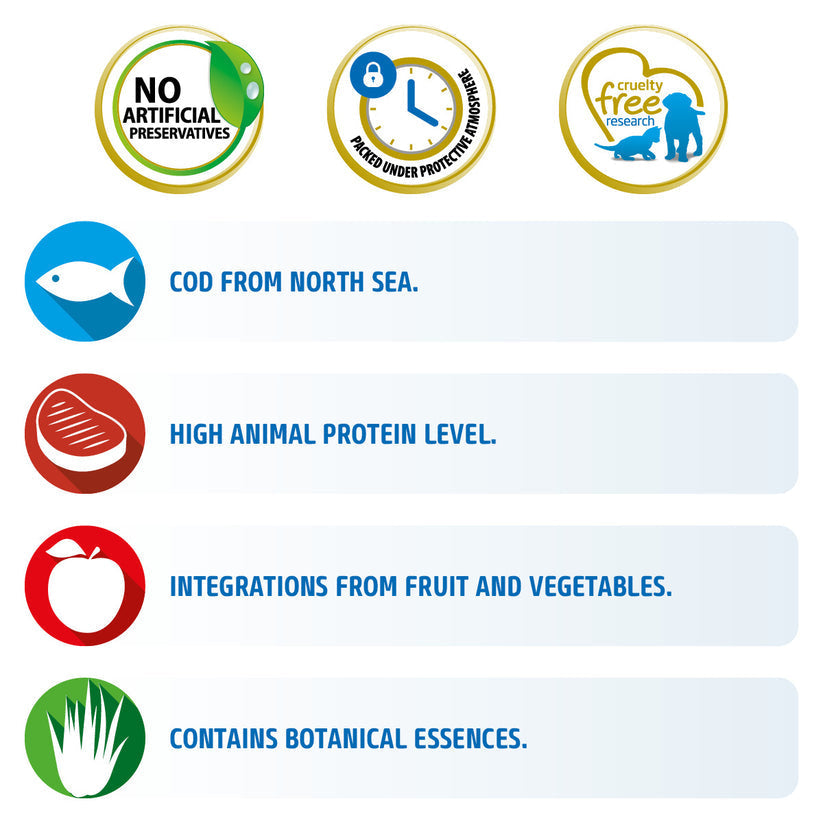 96% of protein from animal origin, 0% artificial preservatives, 0% grains. The main ingredient, Codfish is high in protein and low in fat, which makes it an excellent protein source. Cod is also high in vitamins and minerals, and a source of Omega-3 fatty acids which contribute to the functioning of the cardiovascular, endocrine, and immune systems. Pumpkin is a typical vegetable of the Italian food tradition that has unique nutritional and many beneficial properties like anti-diabetic, supports the immune system, Active against free radicals resulting also in an anti-carcinogenic effect, and promotes cardiovascular system protection, regulates intestinal motility, anti-inflammatory effect, soluble fiber, and antioxidants.