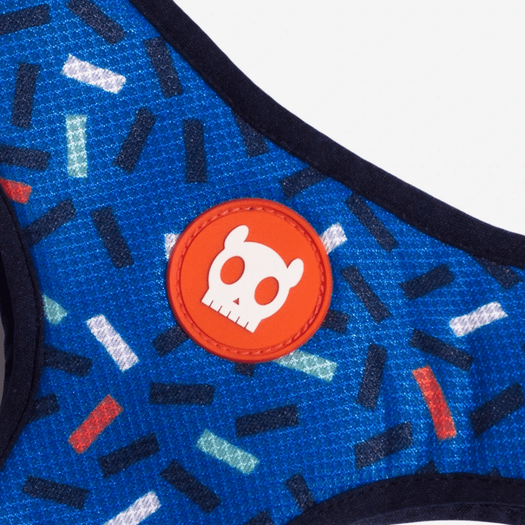 The eye catching dark blue color with a dash of red, turquoise blue and black geometric shapes will make your pooch stand out.