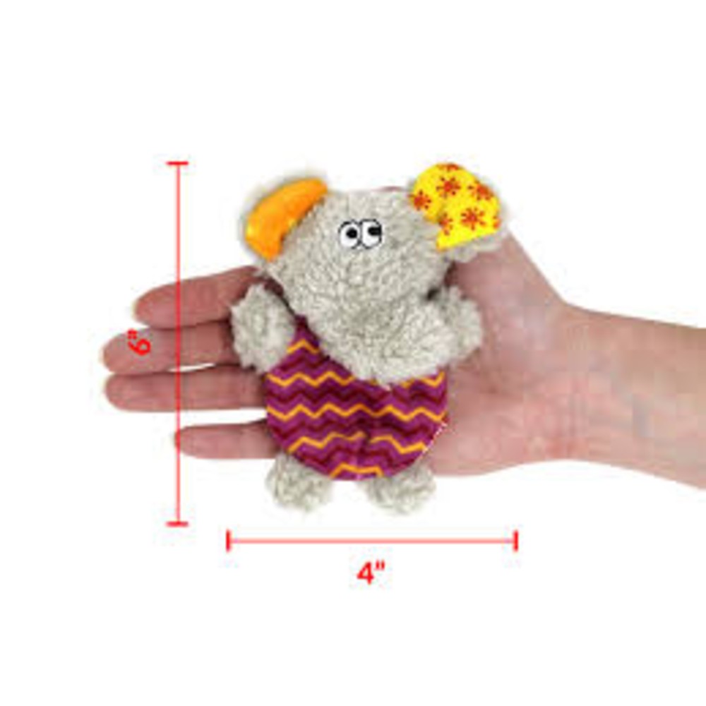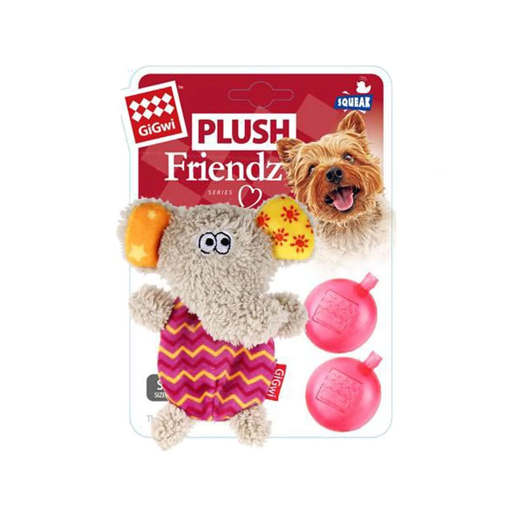 - The details of this sweet and squeaky little elephant will have your pup smitten over their new plush friend. From the super soft fur to the patterned ears and belly, this elephant is sure to be a fast friend. For extra play there are 2 replacement squeakers to fit in the back pouch.