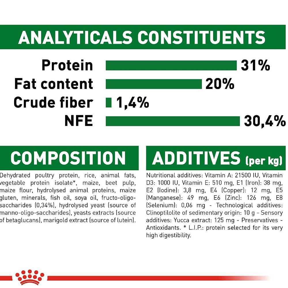 Dehydrated poultry protein, rice, animal fats, vegetable protein isolate*, maize, beet pulp, maize flour, hydrolysed animal proteins, maize gluten,soya oil, fish oil, minerals, fructo-oligo -saccharides, hydrolysed yeast (source of manno-oligo-saccharides), marigold extract (source of lutein).